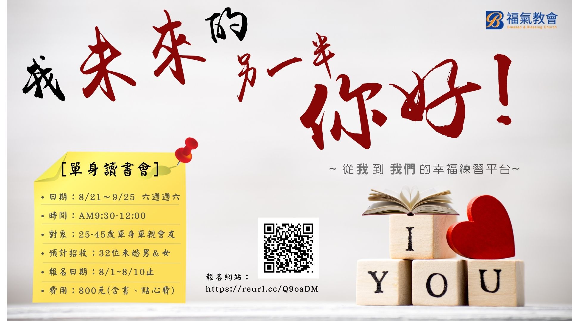 藉由自然、輕鬆、多元的讀書會方式,提供單身會友從「我」到「我們」的幸福練習平台